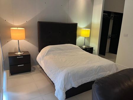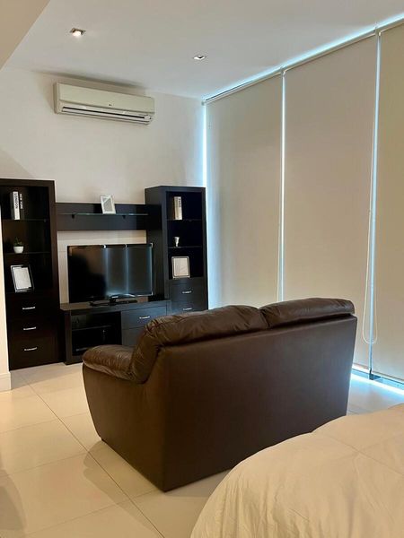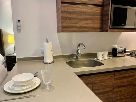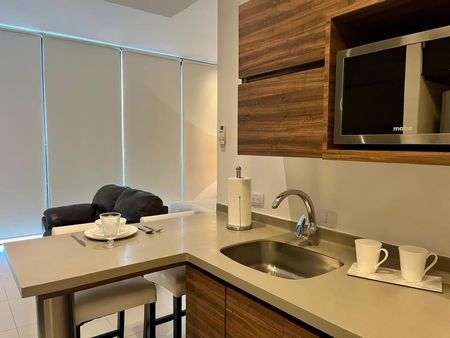 Departamento de 50m2, estilo loft, piso 10, balcón con vista a la Huasteca, totalmente amueblado. Cuenta con cama queen size, lavandería con centro de lavado, barra desayunador para 3 bancos altos, refrigerador, clima de 2 tons, baño completo, cocina con parrilla eléctrica y microondas, closet amplio con cajoneras, cómodo sofá y TV.